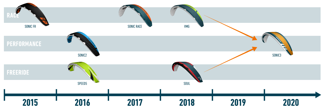 The new generation has a more efficient profile and is easier to launch from the ground. The stability is increased significantly and the kite comparatively has a superb relaunch. The back stalling is reduced and the performance is more accessible. The SONIC3 catches you very well after the down loop and is also great for heli-looping. For increased long-term value retention, the new SONIC comes with all technical features for maintenance. The SONIC2 is slightly lighter, has a softer canopy material and more aspect ratio than its successor, which makes it harder to control in strong winds.
