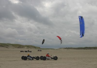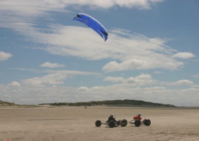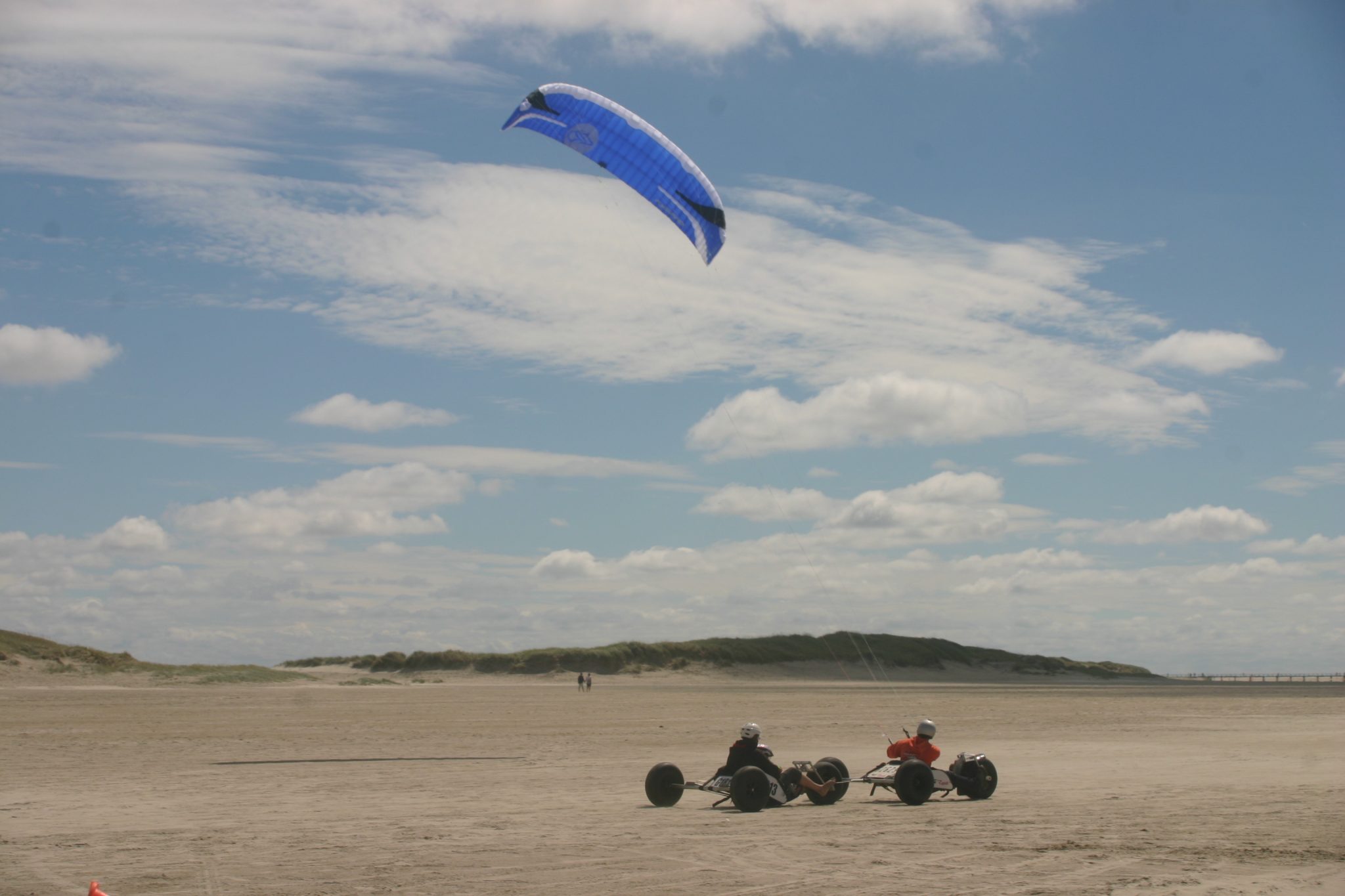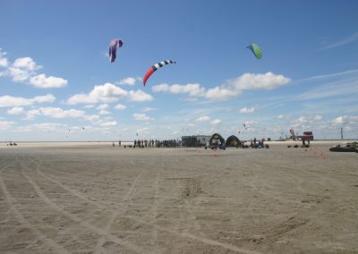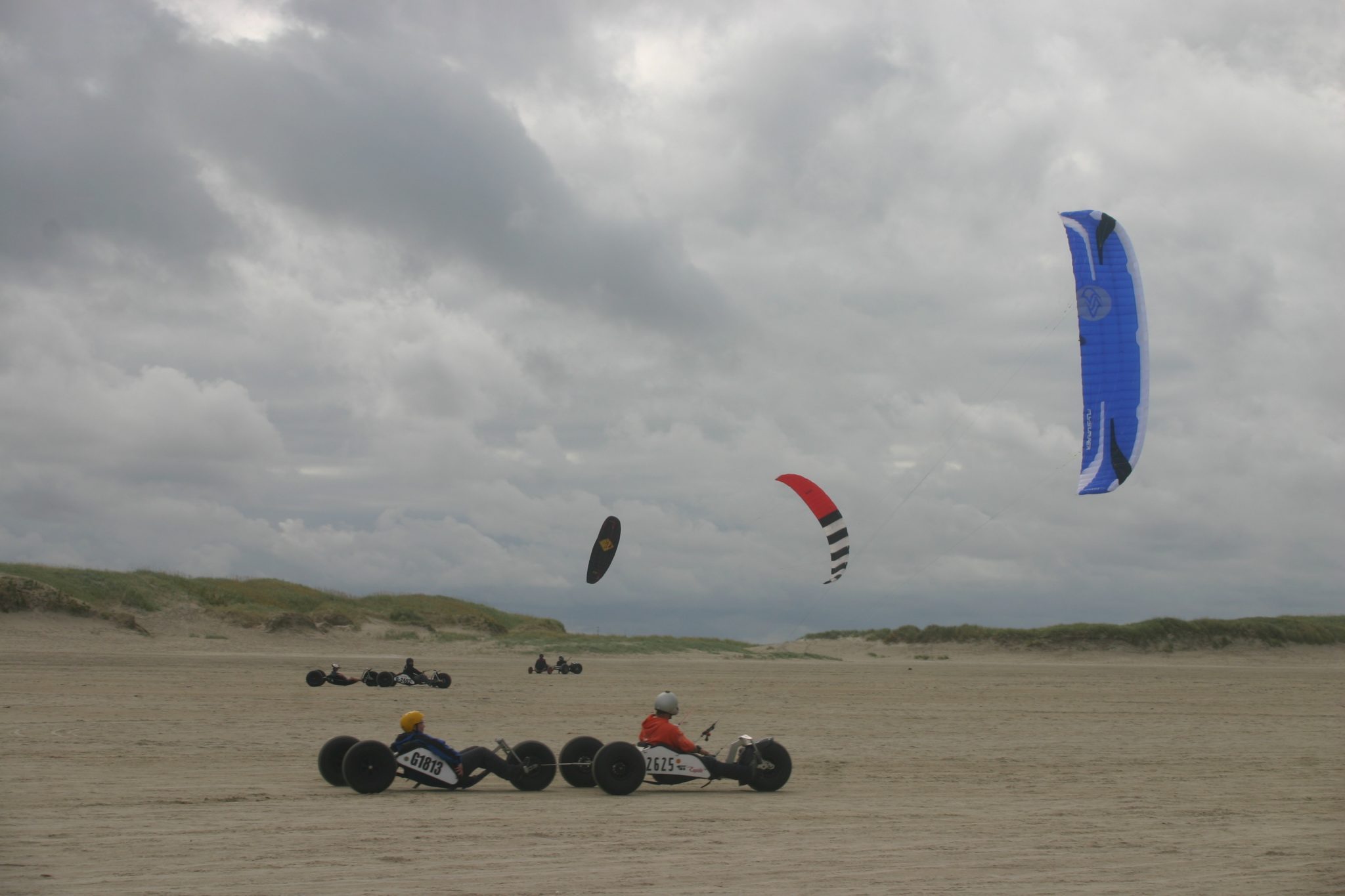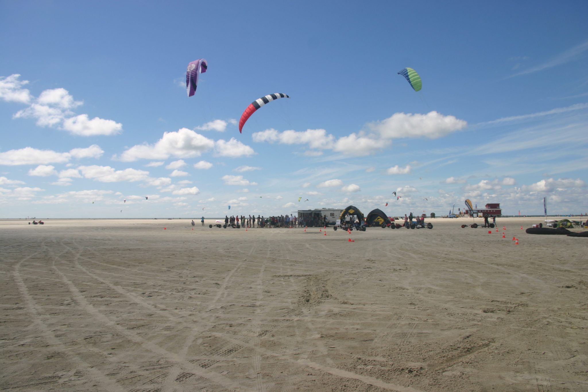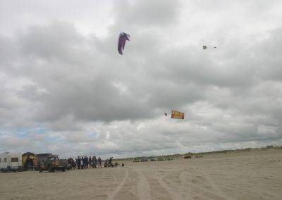 Um 10 Uhr waren wir bereit, alle Interessierten über den weiten Ordinger Strand zu fahren. Der Himmel war anfangs noch bedeckt, aber dies änderte sich gegen Mittag und auch der mangelnde Wind vom letzten Jahr war Geschichte. Wir hatten, wie auf Fanö, Seewind aus West/ Nordwest mit bis zu 15km, was schnell die Angst, dass wir nicht genug Spenden für die Heider Werkstätten sammeln konnten, verschwinden ließ. Eine Gruppe der Heider Werkstätten, eine Einrichtung für körperlich und geistig behinderte Menschen, genoss die Fahrt über den Strand und war sichtlich begeistert. Die Warteschlange für die Taxifahrten wollte einfach bis 17 Uhr kein Ende nehmen: Alle rund 10 Gespanne waren den ganzen Tag über fast durchgehend unterwegs. Als Antrieb standen uns bei sommerlichen Wetter die Speed 5 in der Größe 9 und 12 m² zur Verfügung.