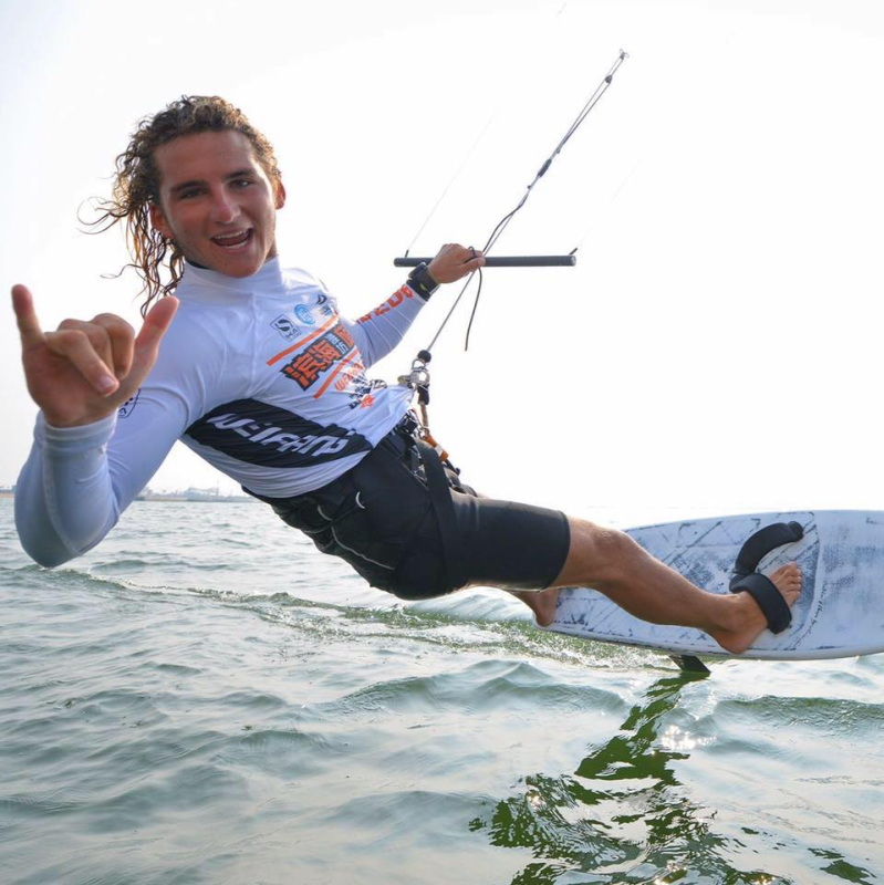 Theo wird von FLYSURFER Kiteboarding, SK shapes, NP Surf und Jeewin Technical Sportscare unterstützt.